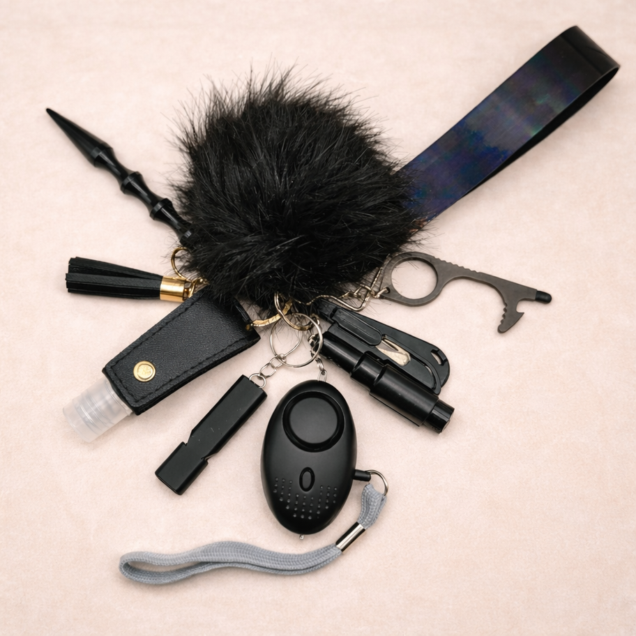 Our Black Safety Set is a coordinated collection of everyday keychain essentials, designed to be both practical and easy to carry. Featuring a personal alarm, safety tools, hand sanitizer holder, and matching accessories, it’s the perfect grab-and-go set to switch between bags and complement your daily routine.