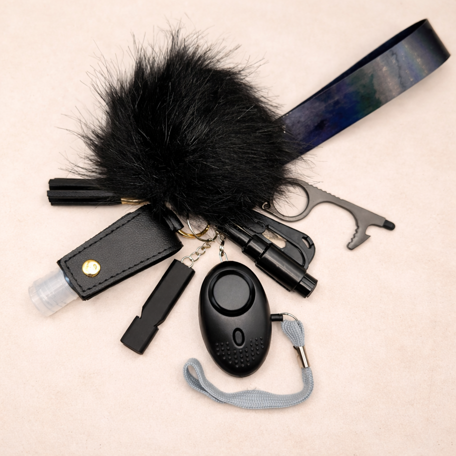 Our Black Safety Set is a coordinated collection of everyday keychain essentials, designed to be both practical and easy to carry. Featuring a personal alarm, safety tools, hand sanitizer holder, and matching accessories, it’s the perfect grab-and-go set to switch between bags and complement your daily routine.