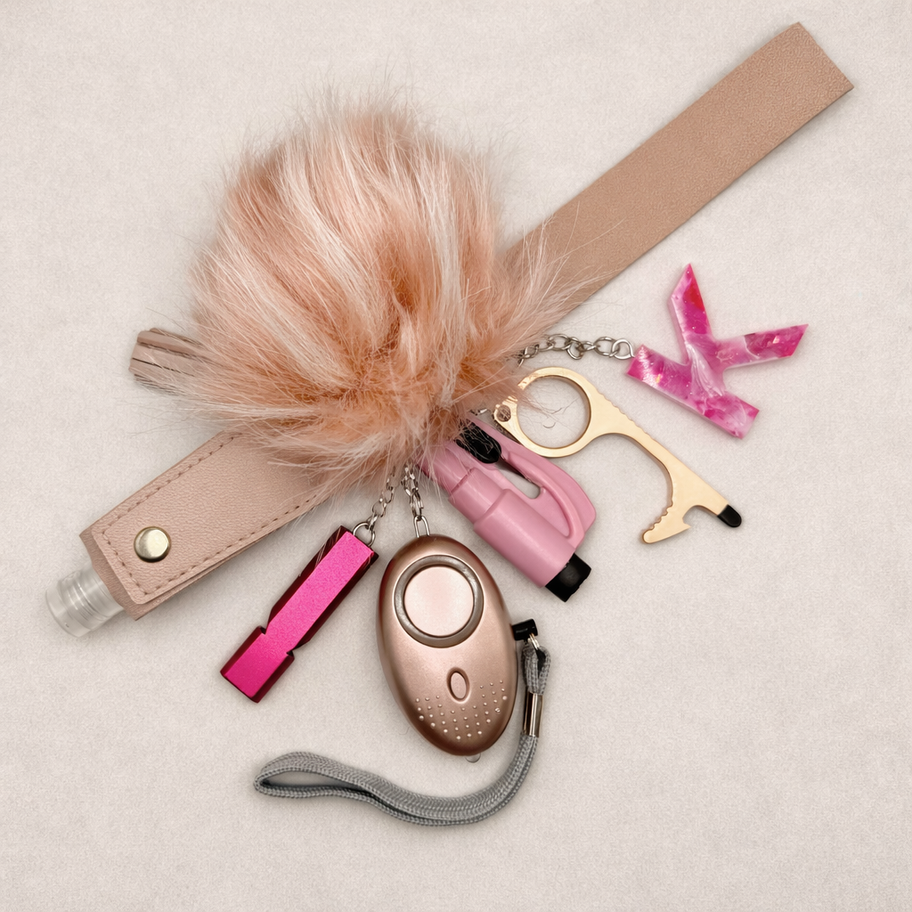 Our Pink Full Set brings together essential keychain accessories in one coordinated design. Including a personal alarm, sanitiser holder, and handmade strap, it’s an easy, practical addition to your daily routine - designed to switch between bags and complement any look.